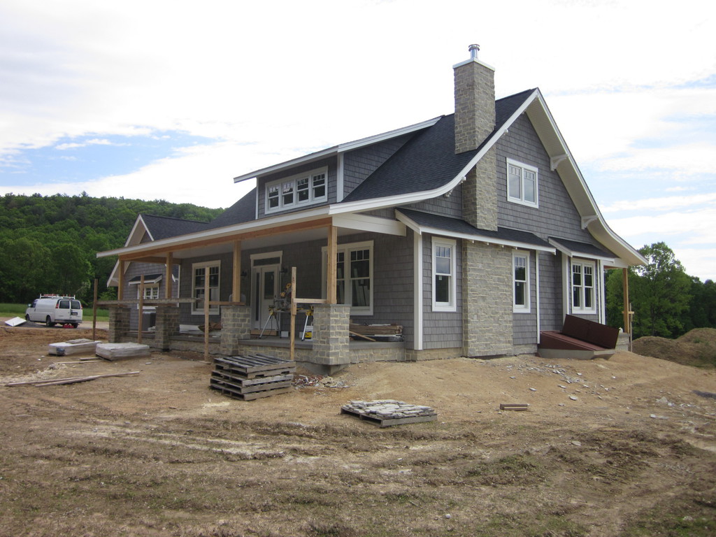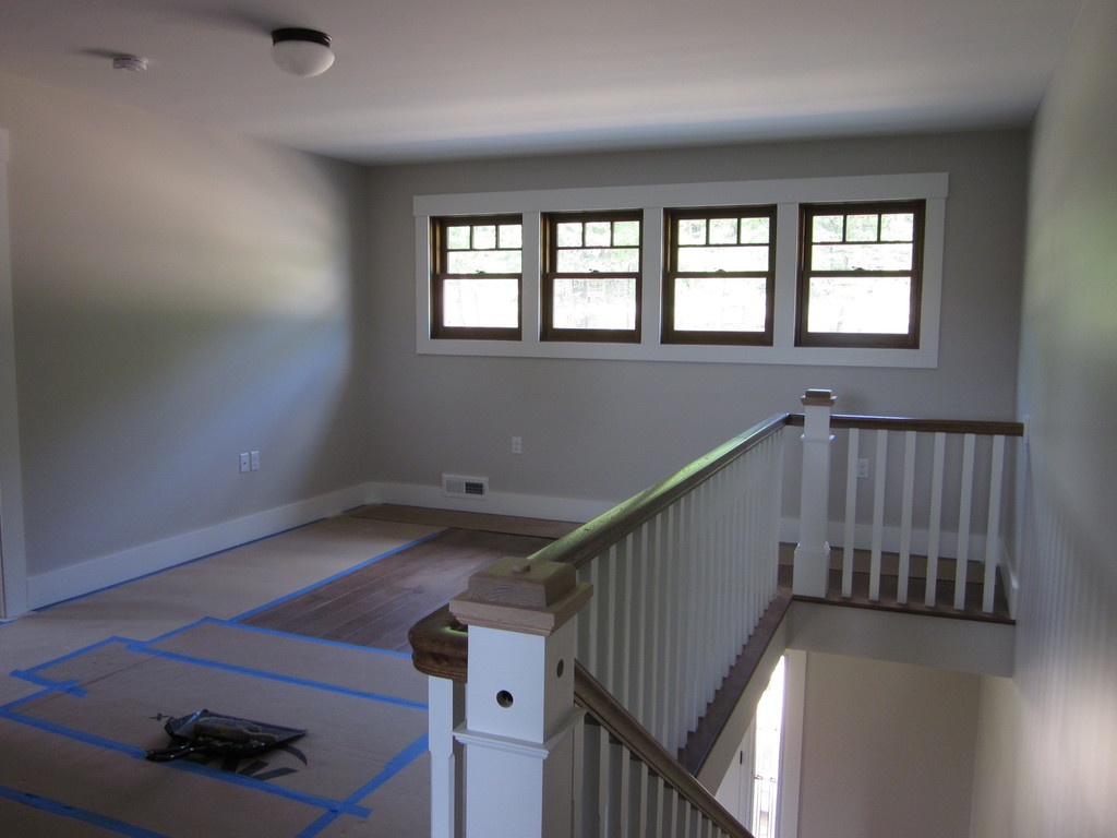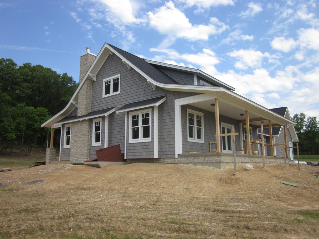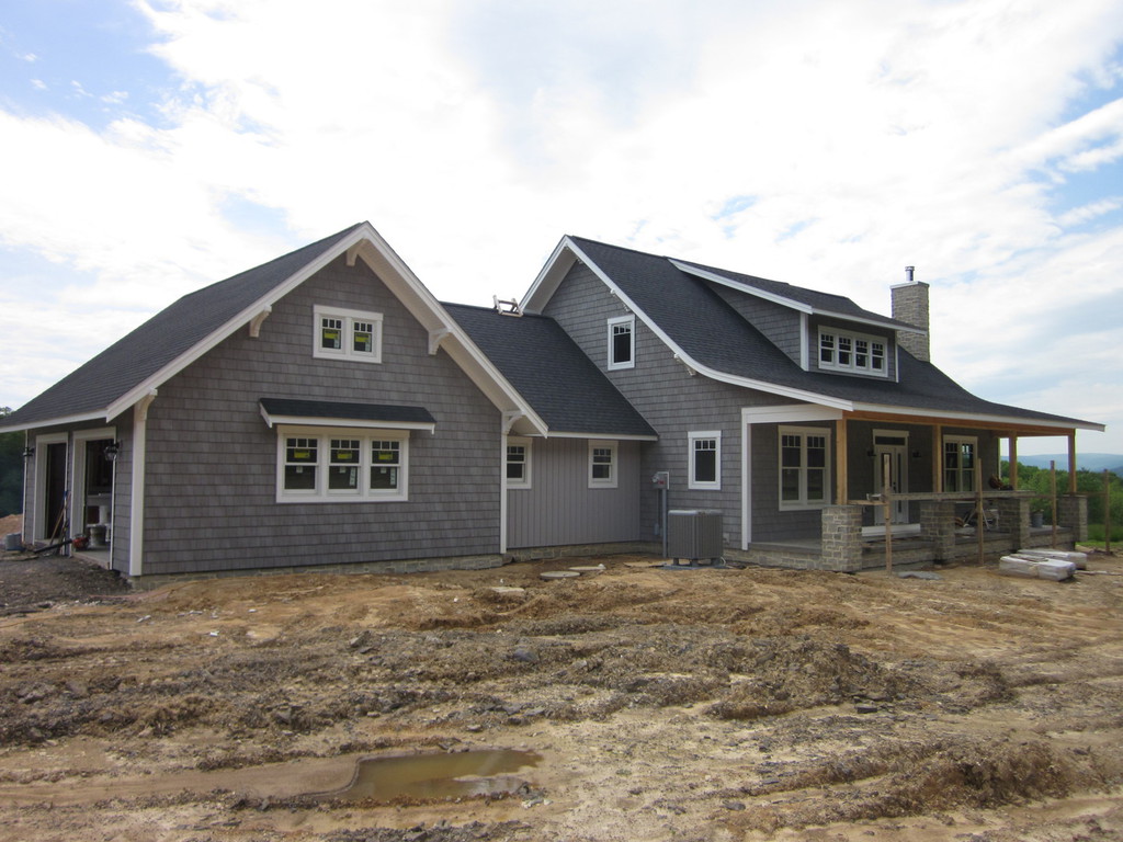 The 1981 gambrel-style, 1,800 SF, house received a total makeover and a 1,700 SF addition. The gambrel house was disguised behind a modern, rustic, saltbox addition. The two-story addition features a monumental stairs that separates the new family room and formal dining of an open floor plan and then curves up to the second floor balcony and recreation/pool table space. The recreation space cantilevers over the first floor spaces to form a grand covered porch for entry to the family room and a new foyer entrance. The original house was modernized to amalgamate with the addition. Renovations included: new windows, increased insulation, vinyl siding, roofing, electrical upgrades and new geo-thermal HVAC system was installed.